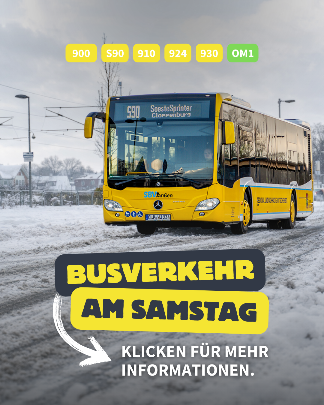 Heute übernimmt SBV Janßen den gesamten Schülerverkehr der Gemeinde Saterland, sowie die Linien 900 und S90 von Cloppenburg, über Garrel, Bösel und Friesoythe bis nach Barßel und Augustfehn. Seit 2019 bedienen wir auch die Linie 910 von Oldenburg nach Friesoythe. 2022 kamen die Linien 924 und 930 hinzu. Und seit Dezember 2023 fahren wir im Auftrag der Landkreise Cloppenburg und Vechta die neue landkreisübergreifende Linie OM1.